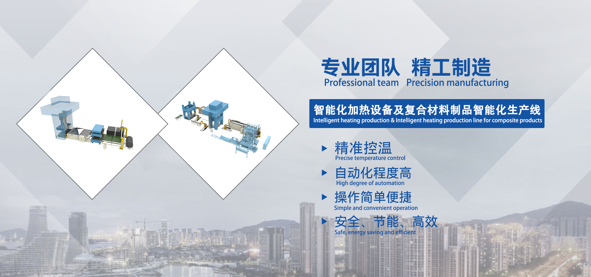 The following fields are covered: Far Infrared Oven, Heated Air Circulation Oven,Industrial oven,Curing furnace,Multilayer oven, Touch type heater,Multi-layer touch type heater,PET composite products intelligent production line,LWRT (lightweight reinforced thermoplastics) intelligent production line, GMT (glass mat reinforced thermoplastics) intelligent production line,LFT (long fiber reinforced thermoplastics) intelligent production line, Intelligent heating production line for Automobile carpet, Intelligent heating production line for Automobile ceiling, Intelligent heating production line for automobile wheel cover, Intelligent heating production line for Automotive interior parts,New energy vehicle battery cover and lower shell intelligent production line, SMC composite products intelligent production line,HP-RTM /HP-CRTM composite products intelligent production line,Intelligent heating production line for composite products, Ultrasonic plastic welding machine, Hot plate welding machine,Teflon strip composite machine, Steel strip composite machine, Felt sheet composite machine, Heating equipment supporting automation equipment, Such as truss loading manipulator and frame loading manipulator, Automatic up and down feeding machine, Spreading Machine, Automatic loading and unloading by robot, Gripper, Acupuncture group, Lorry, Air motor return device, Elevation structure etc.